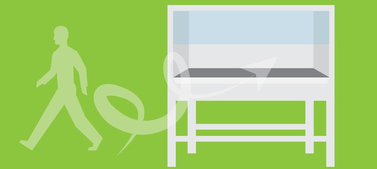 Biyolojik güvenlik kabinine çok hızlı ve çok yakın yürümek kabinin içindeki koruyucu hava akımını da bozabilir. Kabinin önündeki havayı rahatsız etmek kirli ortam havasının kabine girmesine ve muhtemelen kabinden gelen havanın steril çalışma ortamına girmesine neden olabilir. Kabinin önündeki zemine bant veya boya ile "yürüme yasak bölgesi" oluşturmak bu riskleri hafifletmeye yardımcı olabilir.