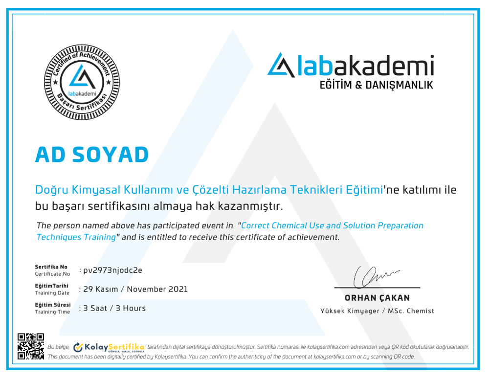 Lab Akademi Başarı Sertifikası, oluşturduğu marka değeri ve güvenilirliği ile herhangi bir sorgulamaya veya tereddüte yer vermeden kabul görmekte ve kariyerinizde önemli bir değer katmaktadır. Laboratuvar kariyerinizi ileri taşımanın en etkili yollarından biri Lab Akademi Başarı Sertifikası'na sahip olmaktır.